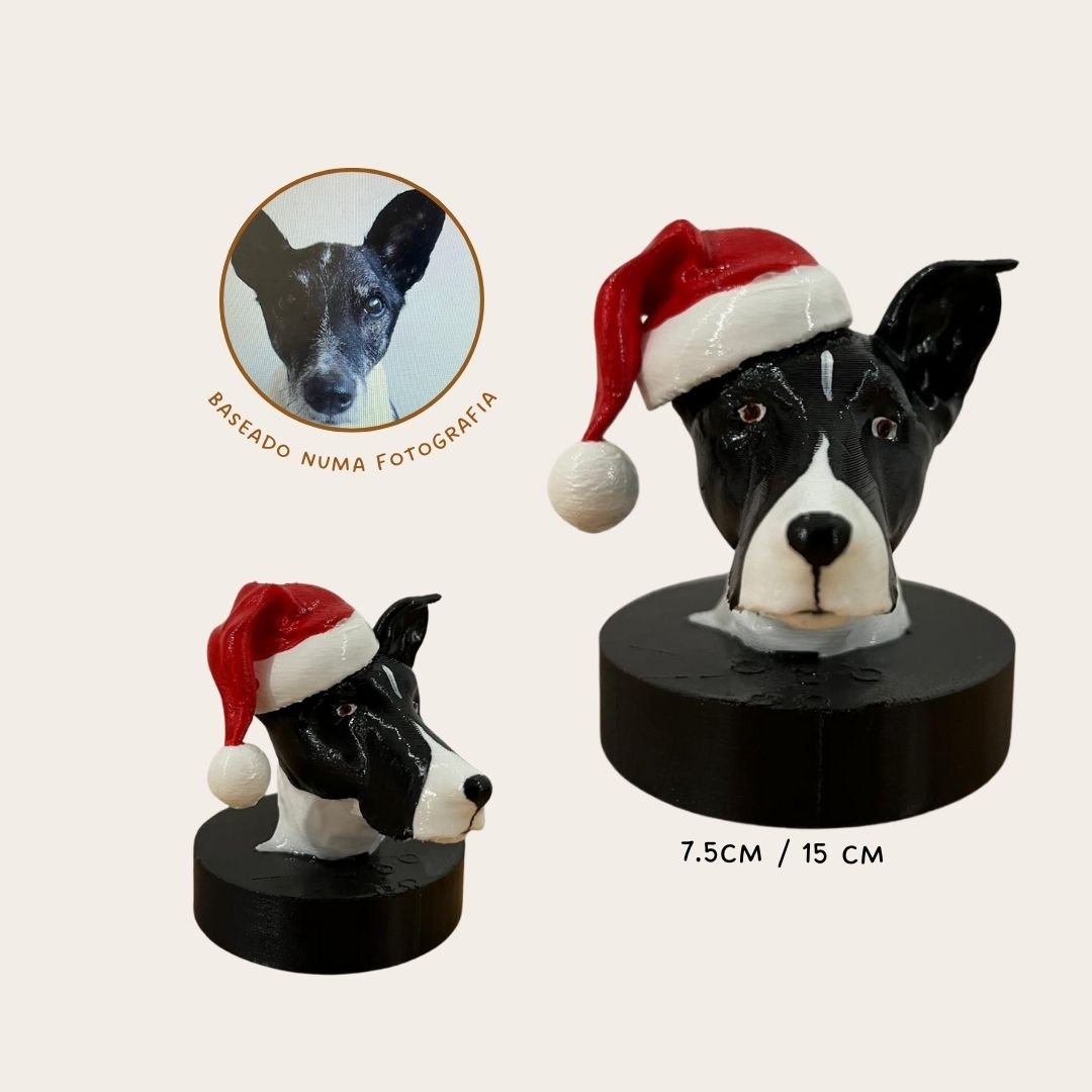 O busto é impresso em 3D em PLA e pintado à mão, garantindo um acabamento artesanal e fiel às características do teu patudo.